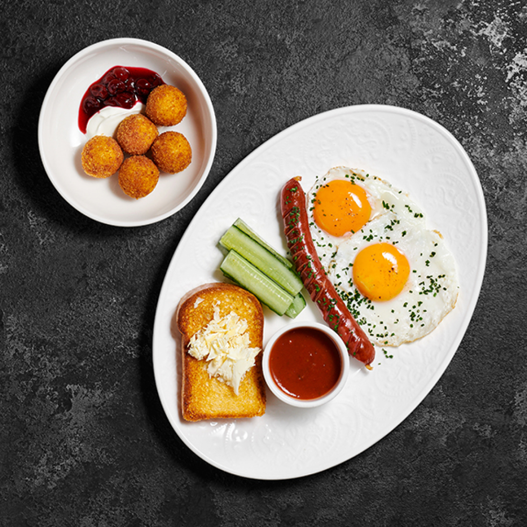 Глазунья (желток полностью прожарен), колбаска охотничья, булочка бриошь, сливочное масло, соус сацебели, пончики из рикотты, сметана, вишнёвый соус.
