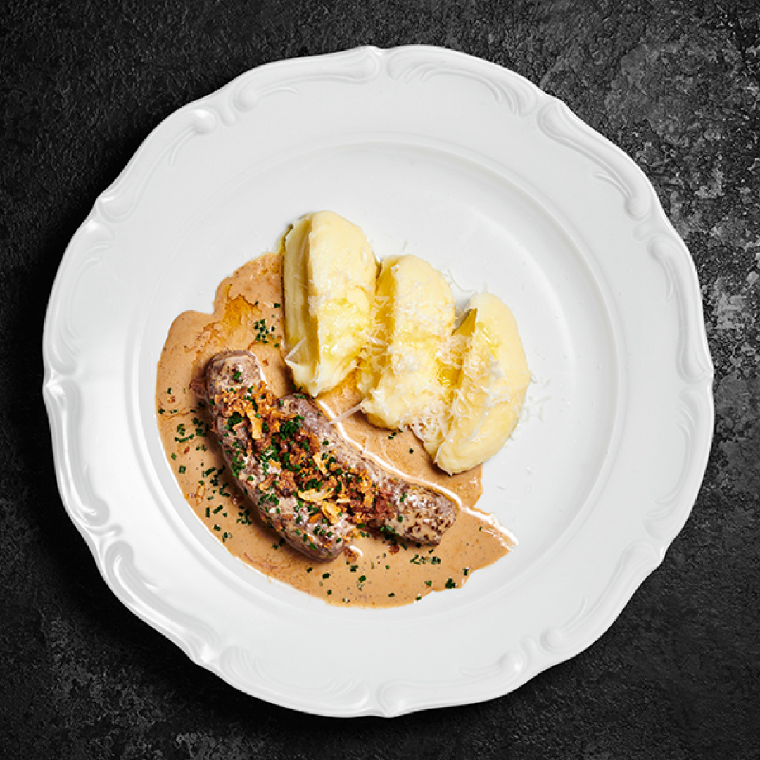 Колбаски из говядины с картофельным пюре и сливочно-перечным соусом