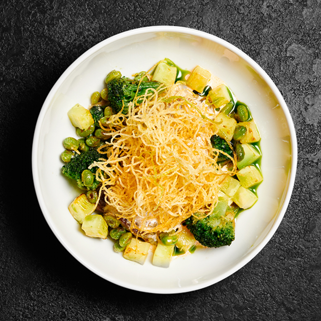 Треска, брокколи, соевые бобы, цукини, белое вино, паста том ям, сливки, молоко, специи, зелёное, картофель пай