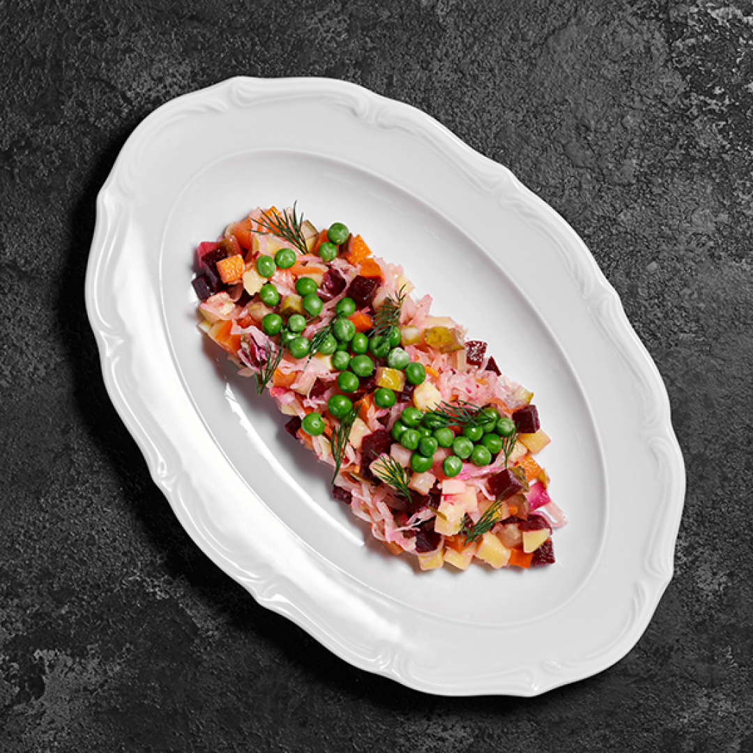 Свёкла, картофель, морковь, маринованный огурец , маринованная капуста, горошек, оливковое масло, микро зелень