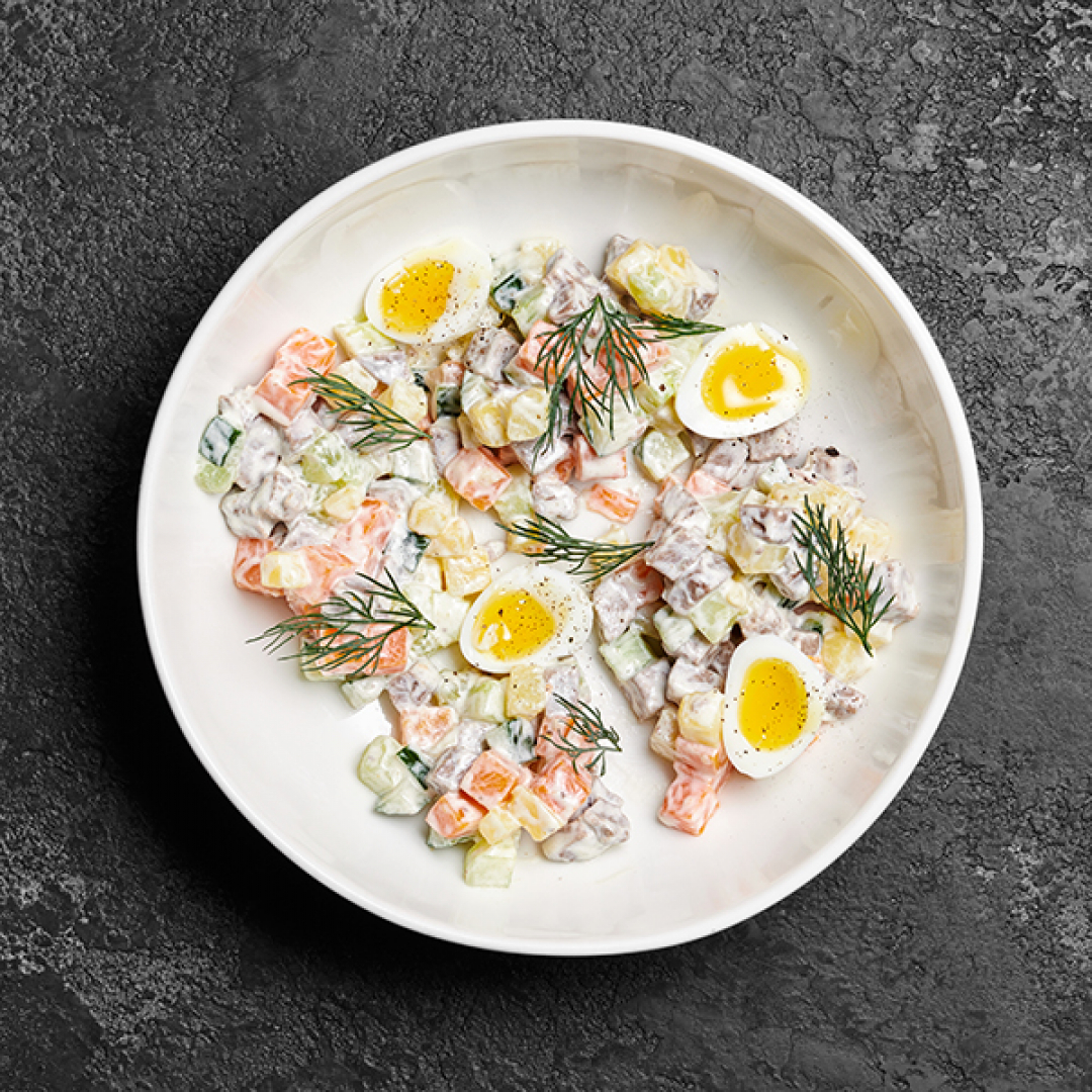 Говядина толстый край, огурец, картофель, морковь, яйцо перепелиное, лук-резанец, укроп